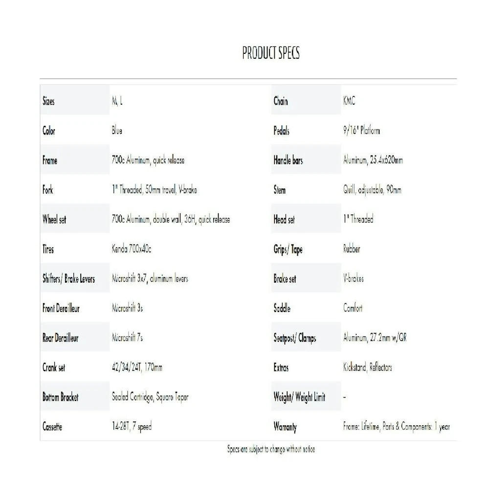 Frame/Fork: Aluminum frame, 50mm suspension fork Tires/Wheels: Kenda 700x40c, aluminum double wall wheels Drivetrain: Microshift 3×7 speed Brakes: V-brakes Adjustable stem and stable frame geometry KEY FEATURES